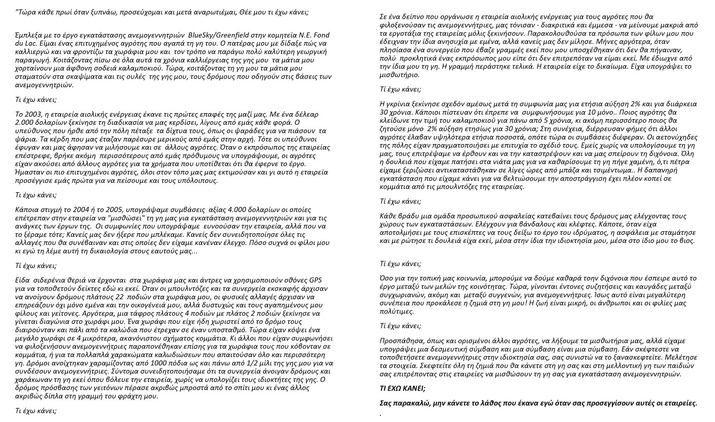 Το παραπάνω κείμενο δημοσιεύτηκε στο Chilton Wisc. Times-Journal, 25 Οκτωβρίου 2007. Γράφτηκε από τον Don Bangert εκ μέρους ενός αγρότη που το συμβόλαιο του με μια εταιρεία εγκατάστασης ανεμογεννητριών τον δεσμεύει να μην μιλάει δημοσίως για τα προβλήματα που δημιούργησε η εγκατάσταση των αιολικών. Ο Bangert υποστηρίζει ότι το άρθρο του αντιπροσωπεύει κι άλλους αγρότες που έχουν τα ίδια συναισθήματα απόγνωσης τα οποία εκφράζονται στο κείμενο και αν τους επιτρεπόταν να μιλήσουν θα είχαν να πουν πολλά δυσάρεστα για τις επιπτώσεις της εγκατάστασης αιολικών στη γη τους. Αυτός είναι ο λόγος που οι εταιρείες, βάσει των συμφωνιών που υπέγραψαν οι αγρότες, τους απαγορεύουν να δημοσιεύουν ο,τιδήποτε σχετικά με το θέμα.