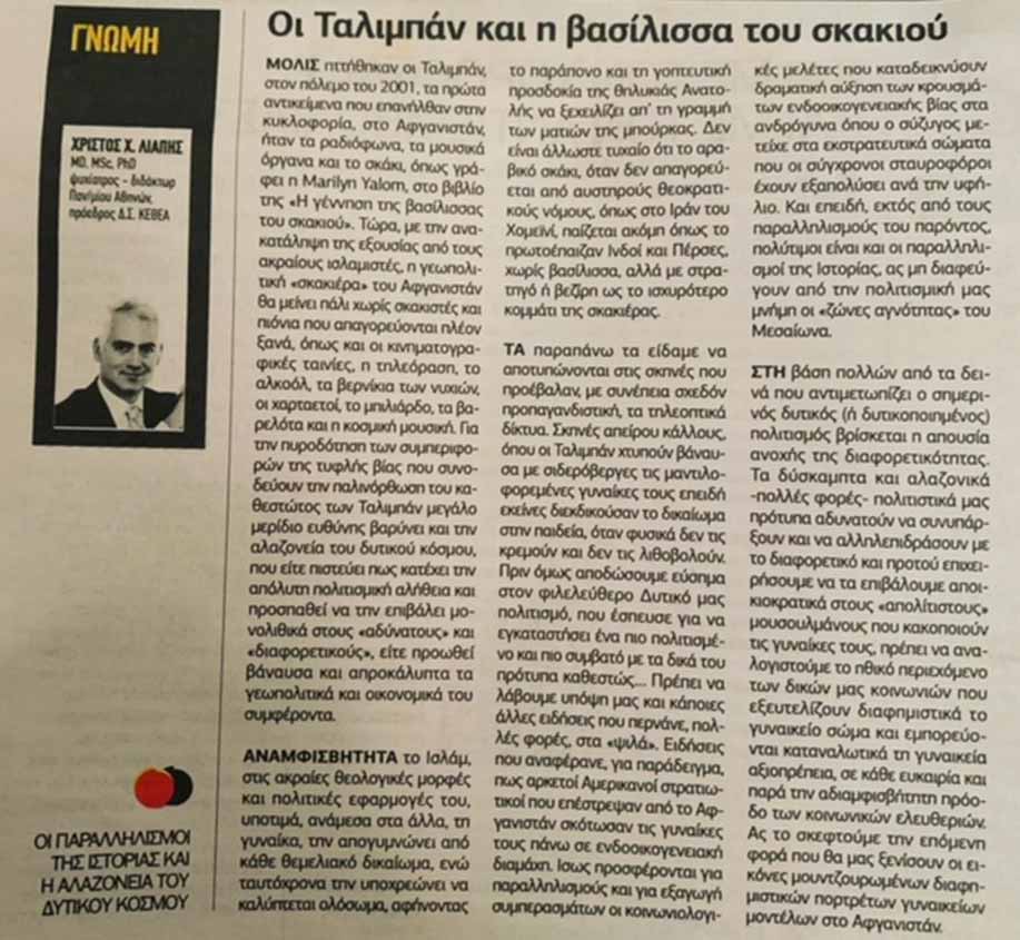 Στον «ΕΛΕΥΘΕΡΟ ΤΥΠΟ» δημοσιεύθηκε, στο φύλλο της Παρασκευής 27/08/2021, άρθρο του Ψυχιάτρου, Διδάκτορος του Παν/μίου Αθηνών και Προέδρου του ΚΕΘΕΑ, σχετικό με την αντιμετώπιση της “γυναίκας” από τους Ταλιμπάν, αλλά και από τον δυτικό πολιτισμό.