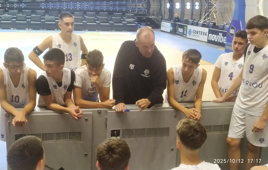 Ο coach Κώστας Σερίφης των γηπεδούχων, τα λέει… με τους παίκτες του, στη διάρκεια ενός time–out.