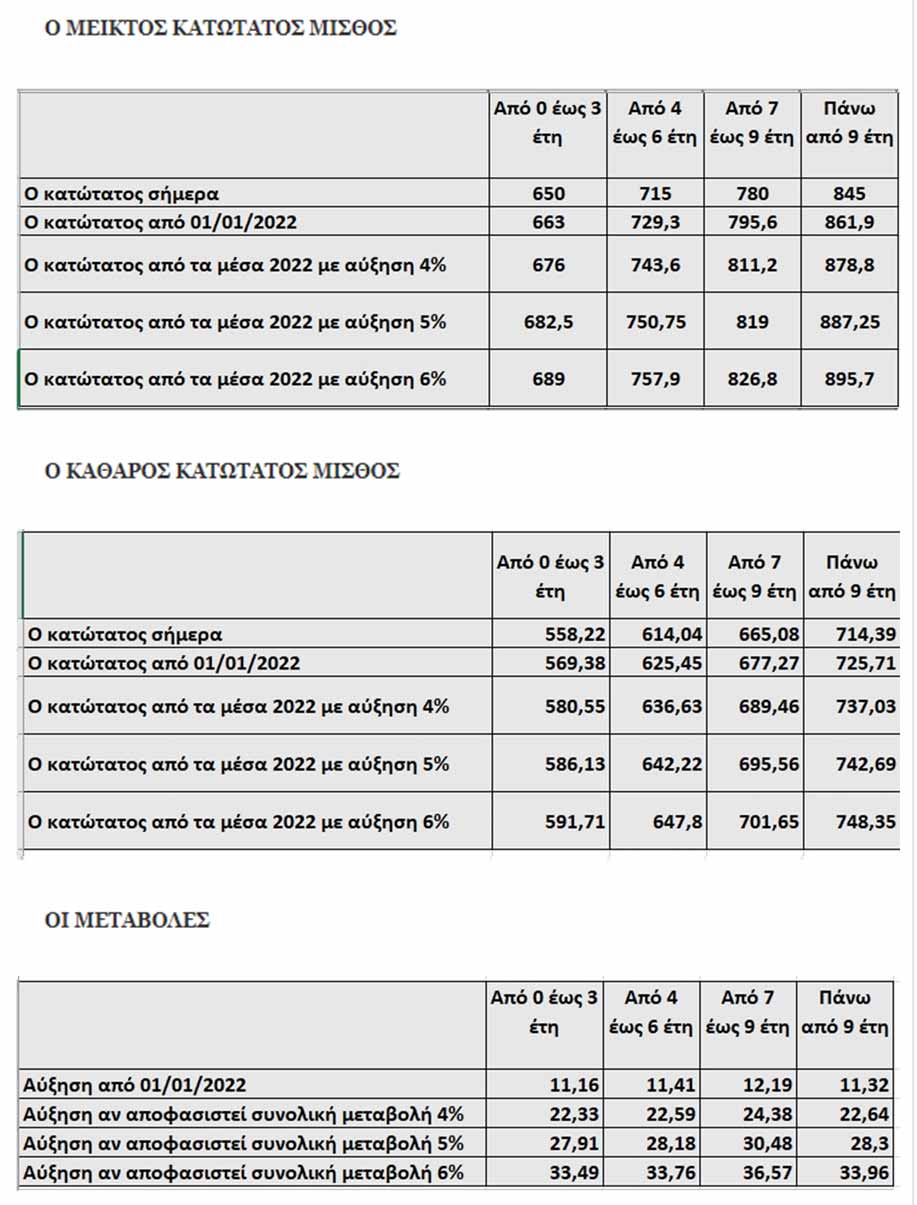 3. Το πιο αισιόδοξο σενάριο για αύξηση 2% από 1/1/2022 συν 4% μέσα στο έτος, που είναι και αυτό που φέρνει τον κατώτατο μισθό από τα 689 ευρώ έως τα 895 ευρώ ανάλογα με τις τριετίες.