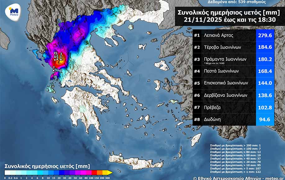 Πολύ μεγάλα ύψη βροχής κατέγραψε το δίκτυο αυτόματων μετεωρολογικών σταθμών του meteo.gr/ Εθνικού Αστεροσκοπείου Αθηνών από τις ισχυρές βροχές και καταιγίδες που σημειώθηκαν στην Ήπειρο την Παρασκευή 21/11.