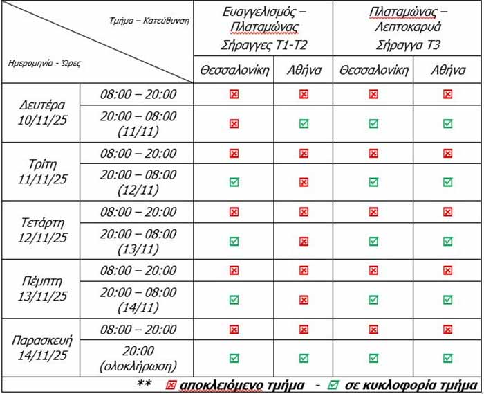 - Τετάρτη 12 Νοεμβρίου 2025 απόγευμα: απόδοση σε κυκλοφορία τμήματος Ευαγγελισμός – Λεπτοκαρυά προς Θεσσαλονίκη και Λεπτοκαρυά – Πλαταμώνας προς Αθήνα (θα παραμείνει αποκλεισμένο το τμήμα Πλαταμώνας – Ευαγγελισμός προς Αθήνα).