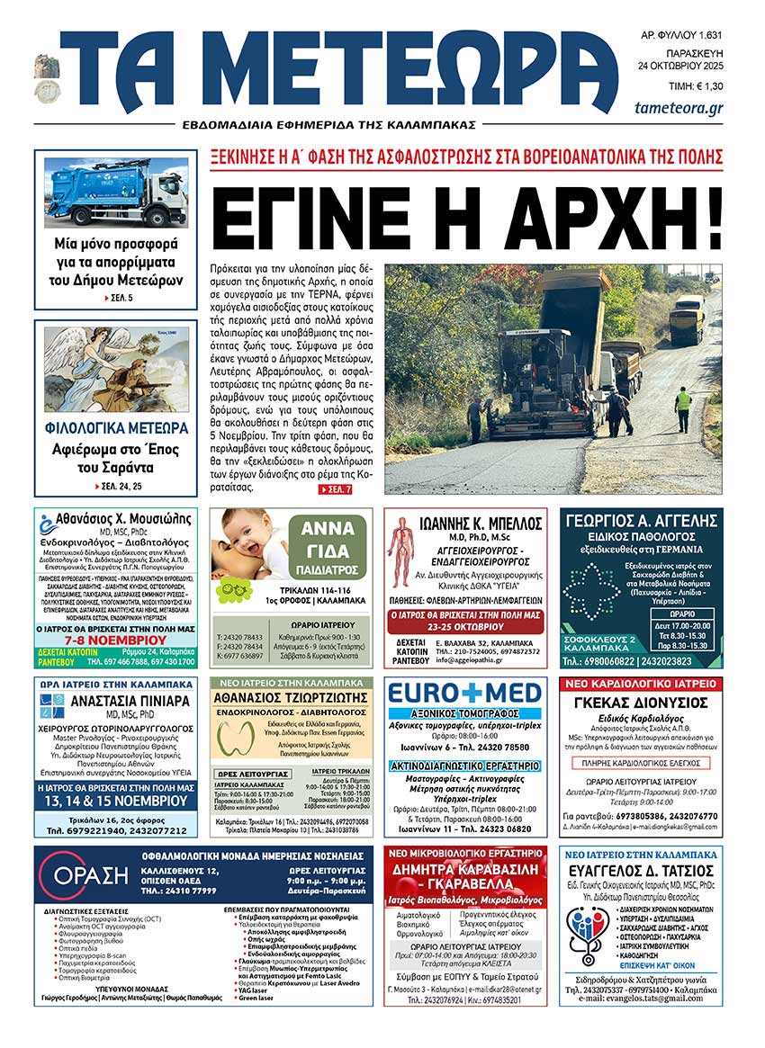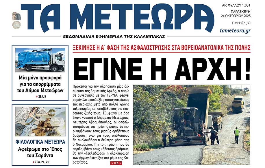 Με κύριο θέμα τη χθεσινή εκκίνηση της πρώτης φάσης της ασφαλτόστρωσης των δρόμων στο νέο σχέδιο πόλεως στα βορειοαναταολικά της Καλαμπάκας, κυκλοφορεί σήμερα Παρασκευή 24 Οκτωβρίου η εφημερίδα ΤΑ ΜΕΤΕΩΡΑ.