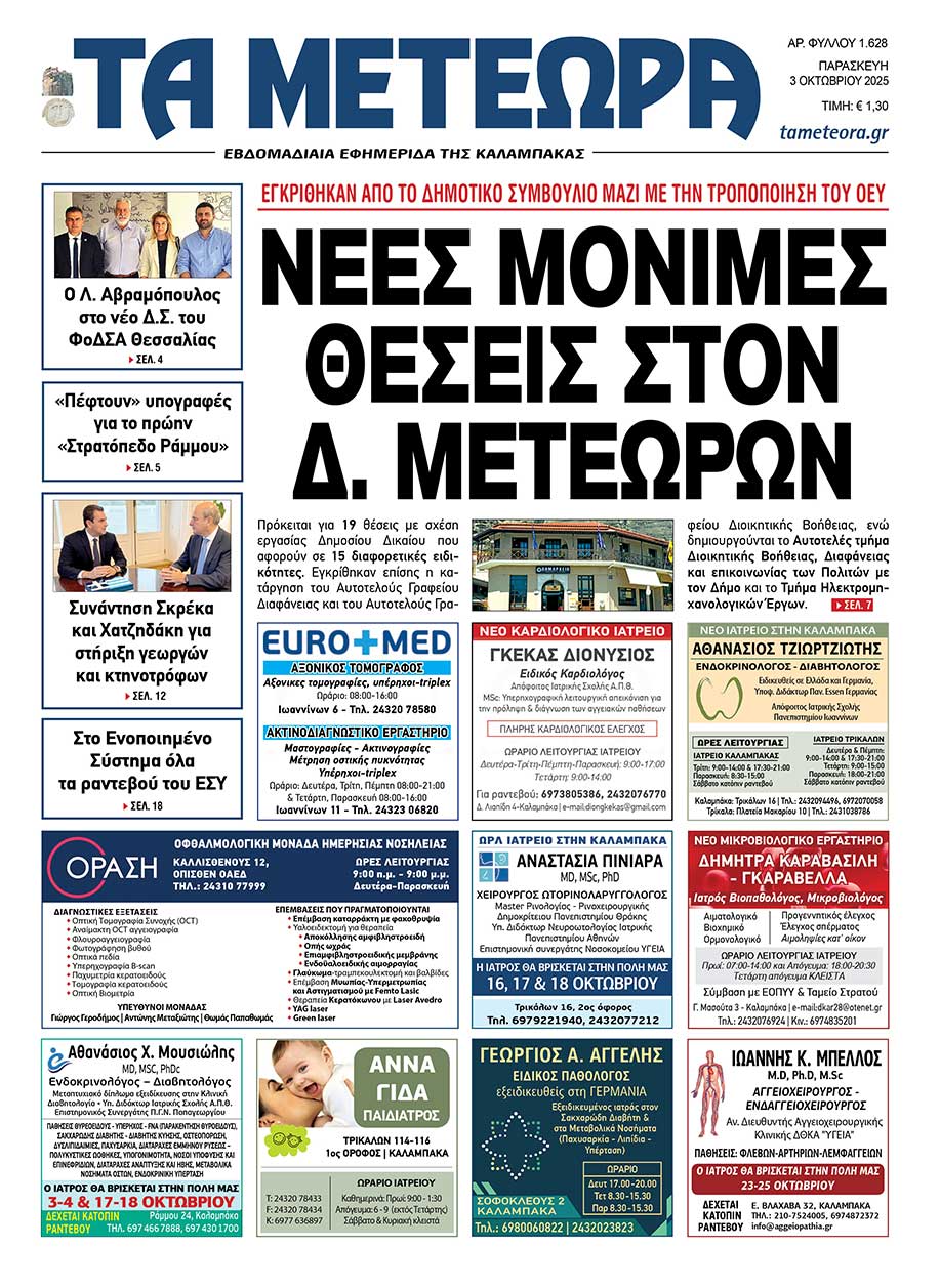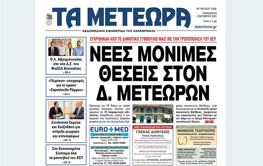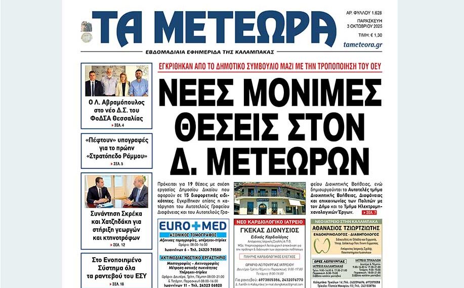 Με κύριο θέμα τις νέες μόνιμες θέσεις στον Δήμο Μετεώρων, που εγκρίθηκαν από το Δημοτικό Συμβούλιο μαζί με την τροποποίηση του Οργανισμού Εσωτερικής Υπηρεσίας (ΟΕΥ), κυκλοφορεί σήμερα Παρασκευή 3 Οκτωβρίου η εφημερίδα ΤΑ ΜΕΤΕΩΡΑ.