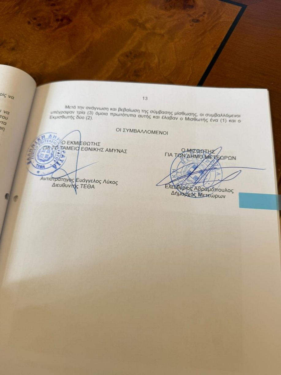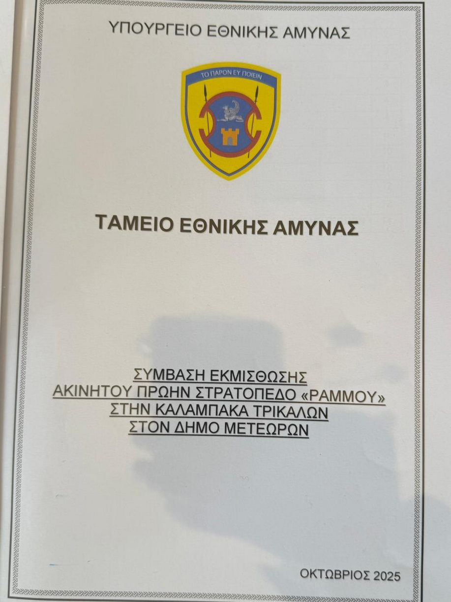 Η υπογραφή του πρωτοκόλλου μεταβίβασης πραγματοποιήθηκε σήμερα από τον Δήμαρχο Μετεώρων Λευτέρη Αβραμόπουλο και τον Διευθυντή του Ταμείου Εθνικής Άμυνας Αντιστράτηγο Ευάγγελο Λύκο, επισφραγίζοντας μια πολυετή προσπάθεια που ξεκίνησε εδώ και δεκαετίες από την τοπική αυτοδιοίκηση.
