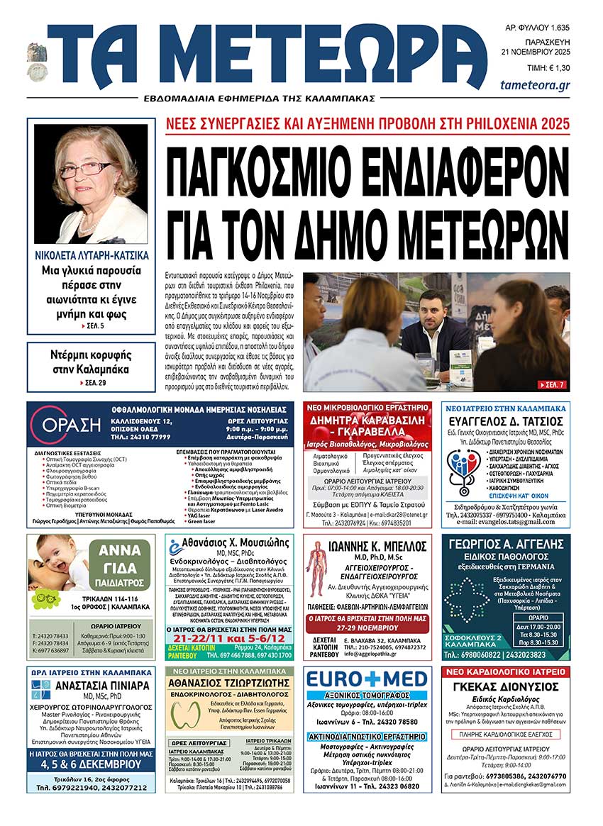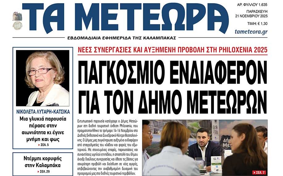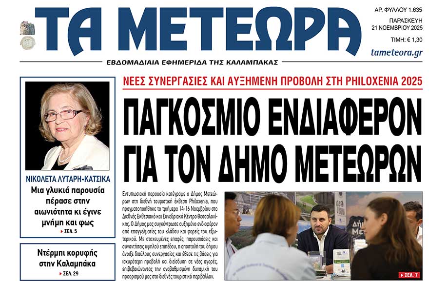 Με κύριο θέμα το παγκόσμιο ενδιαφέρον που εκφράστηκε στη Philoxenia 2025 για τον Δήμο Μετεώρων από επαγγελματίες του τουρισμού και φορείς του Εξωτερικού κυκλοφορεί σήμερα Παρασκευή 21 Νοεμβρίου η εφημερίδα ΤΑ ΜΕΤΕΩΡΑ.