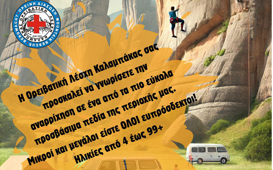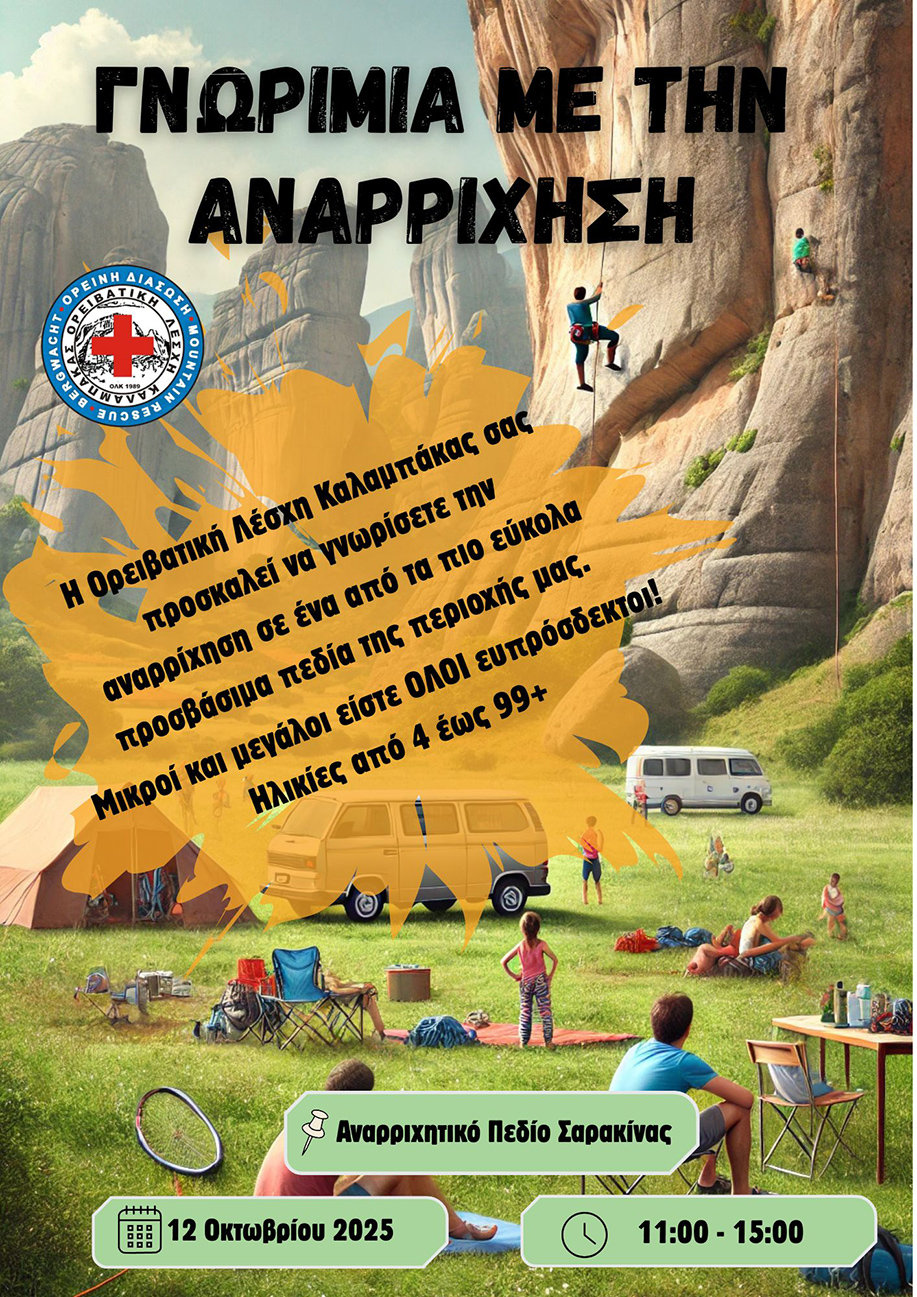 Η Ορειβατική Λέσχη Καλαμπάκας προσκαλεί μικρούς και μεγάλους στην ανοιχτή εκδήλωση με τίτλο “Γνωριμία με την αναρρίχηση”, την Κυριακή 12 Οκτωβρίου 2025, από τις 11:00 έως τις 15:00, στο αναρριχητικό πεδίο της Σαρακίνας.