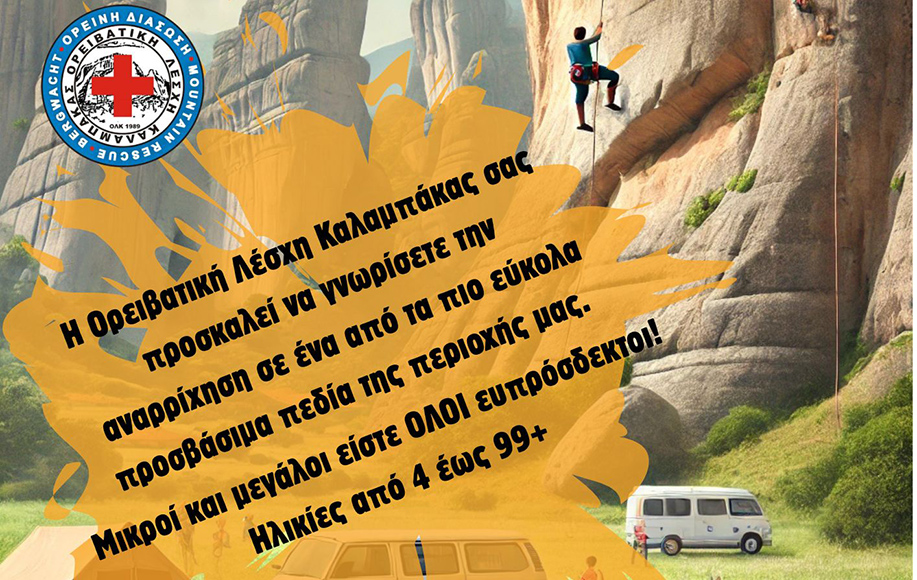 Η Ορειβατική Λέσχη Καλαμπάκας προσκαλεί μικρούς και μεγάλους στην ανοιχτή εκδήλωση με τίτλο “Γνωριμία με την αναρρίχηση”, την Κυριακή 12 Οκτωβρίου 2025, από τις 11:00 έως τις 15:00, στο αναρριχητικό πεδίο της Σαρακίνας.