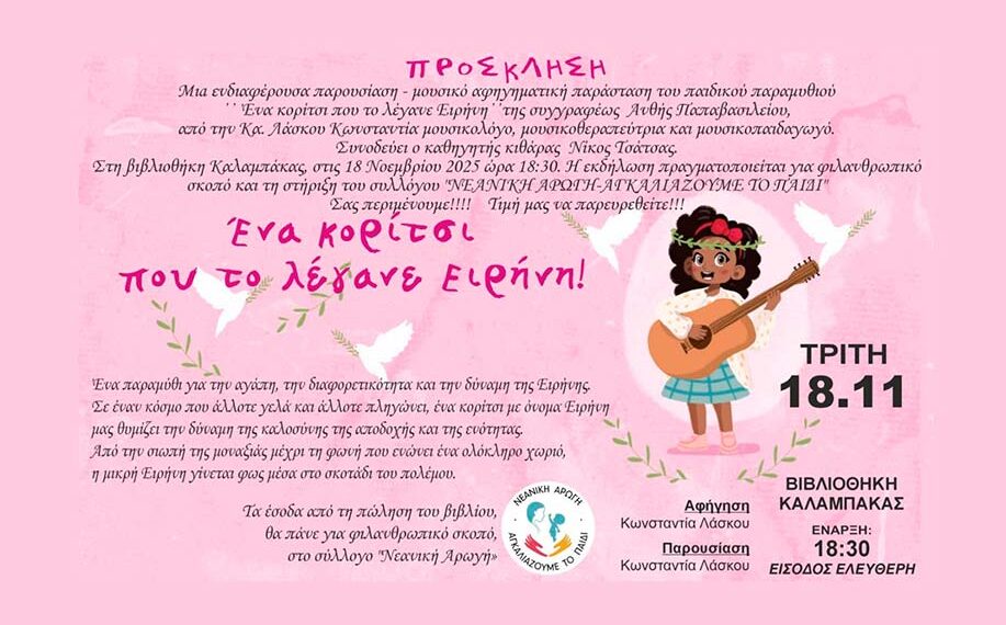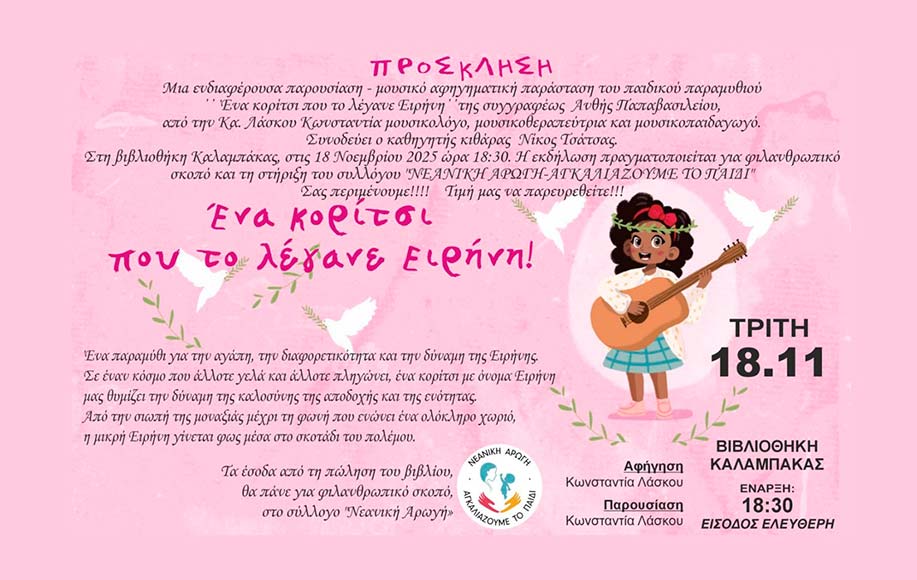 Η Βιβλιοθήκη σας προσκαλεί τη Τρίτη 18 Νοεμβρίου στις 6:30 μ.μ. σε μια ξεχωριστή μουσικο-αφηγηματική βραδιά με αφορμή το βιβλίο «Ένα κορίτσι που το έλεγαν Ειρήνη» της Ανθής Παπαβασιλείου.