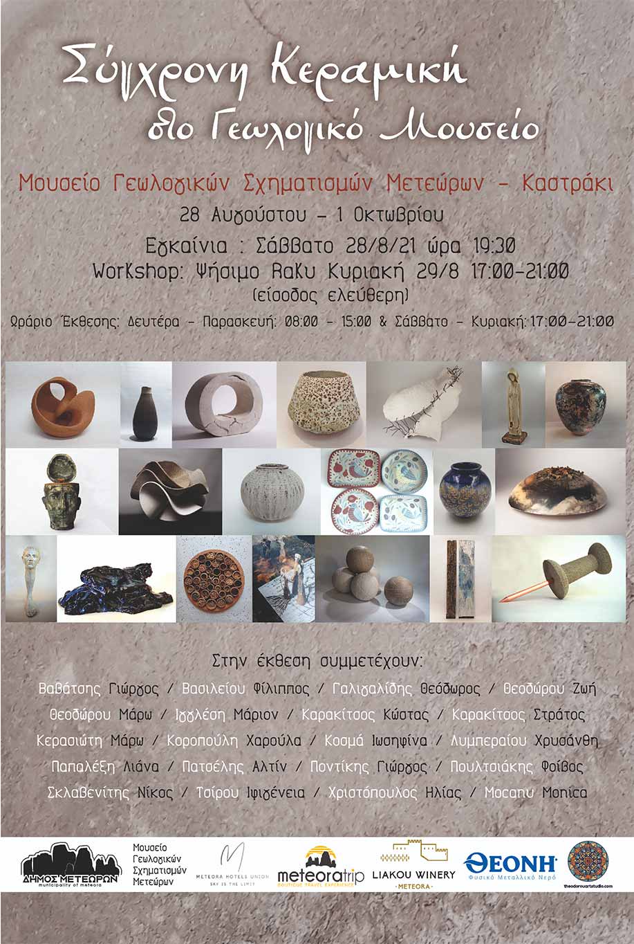 Το Theodorou Art Studio έχει τη χαρά να σας προσκαλέσει το Σάββατο 28 Αυνούστου στις 19:30, στα εγκαίνια της ομαδικής έκθεσης σύγχρονης κεραμικής στο Μουσείο Γεωλογικών Σχηματισμών Μετεώρων. Το μουσείο στεγάζεται στο διατηρητέο κτίριο του παλιού Δημοτικού Σχολείου στην κεντρική πλατεία Καστρακίου κάτω από τους βράχους των Μετεώρων, μνημείο πολιτιστικής κληρονομιάς της UNESCO.