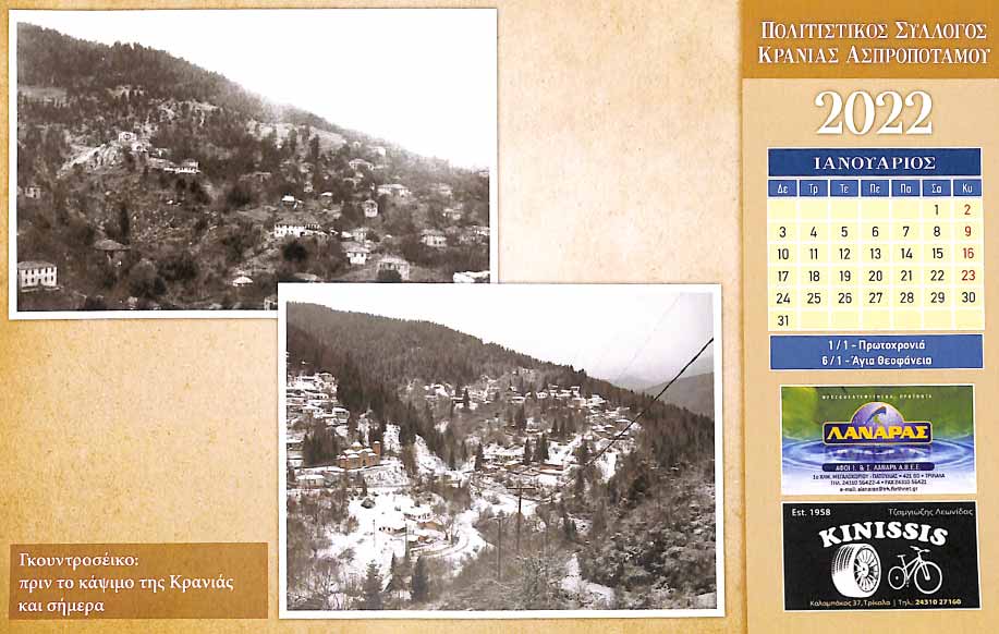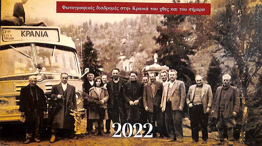 «Φωτογραφικές διαδρομές στην Κρανία του χθες και του σήμερα» είναι το θέμα του φετινού ημερολογίου. «Λα Κόρνου», η βλά¬χικη ονομασία της Κρανιάς, επεκτείνεται τρεις μαχαλάδες στις πλαγιές του Κρανιώτικου ποταμού. Συλλέξαμε παλιές και νέες φωτογραφίες από διάφορες τοποθεσίες και κτίρια της Κρανιάς προκειμένου να δημι¬ ουργήσουμε ένα φωτογραφικό οδοιπορικό στο χρόνο.