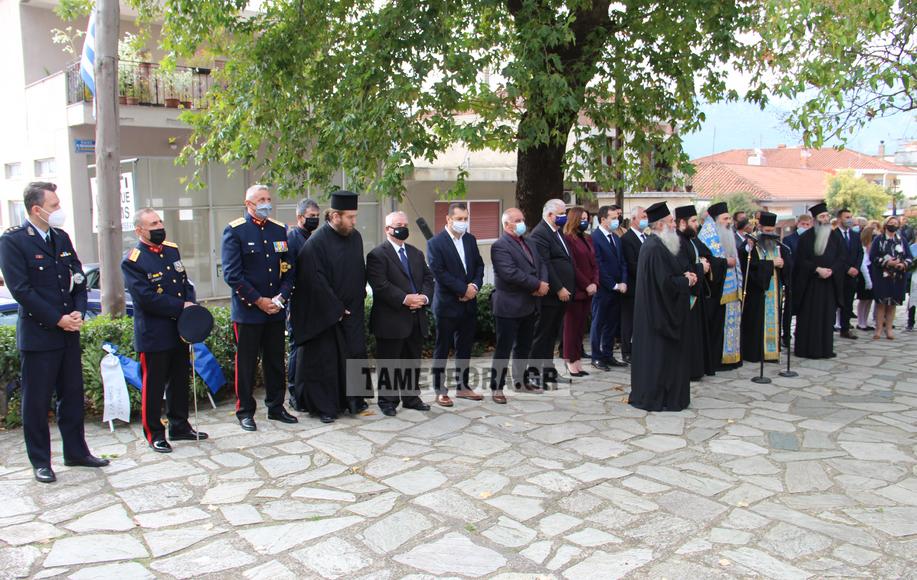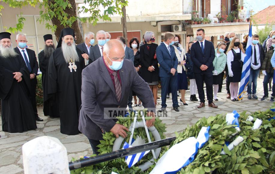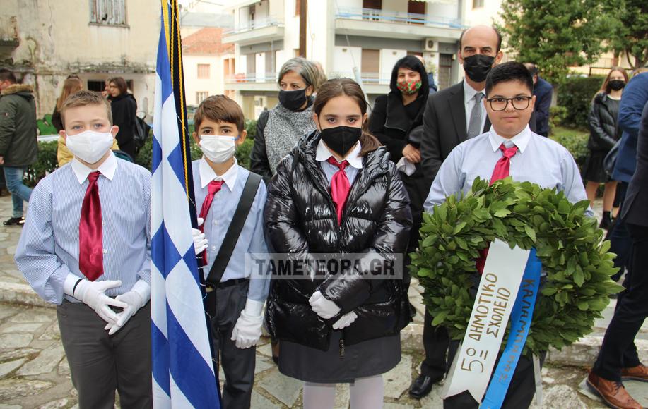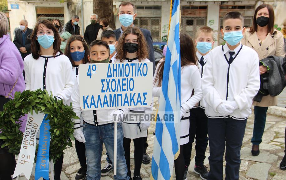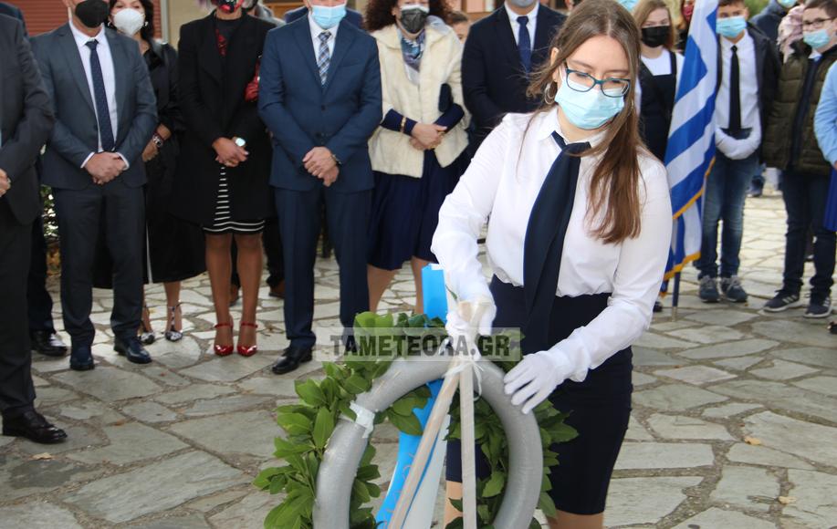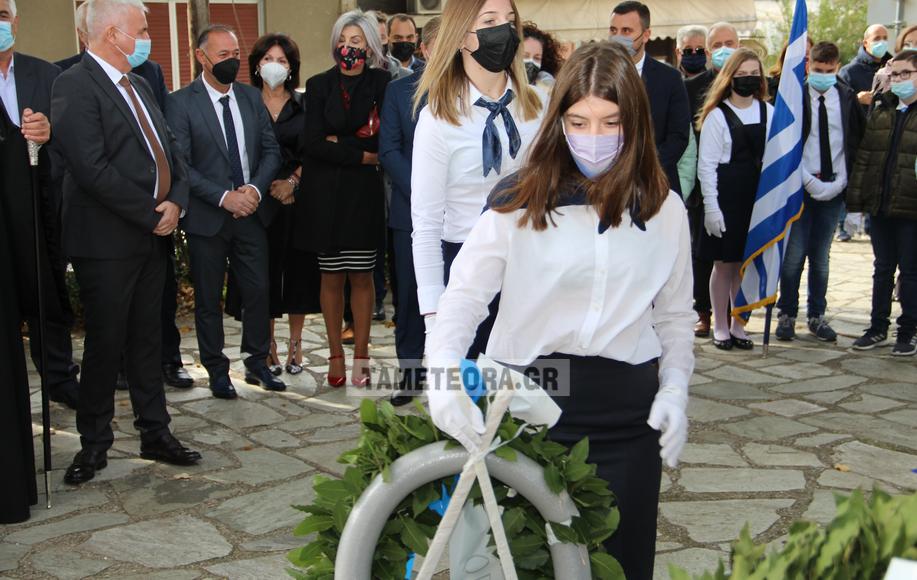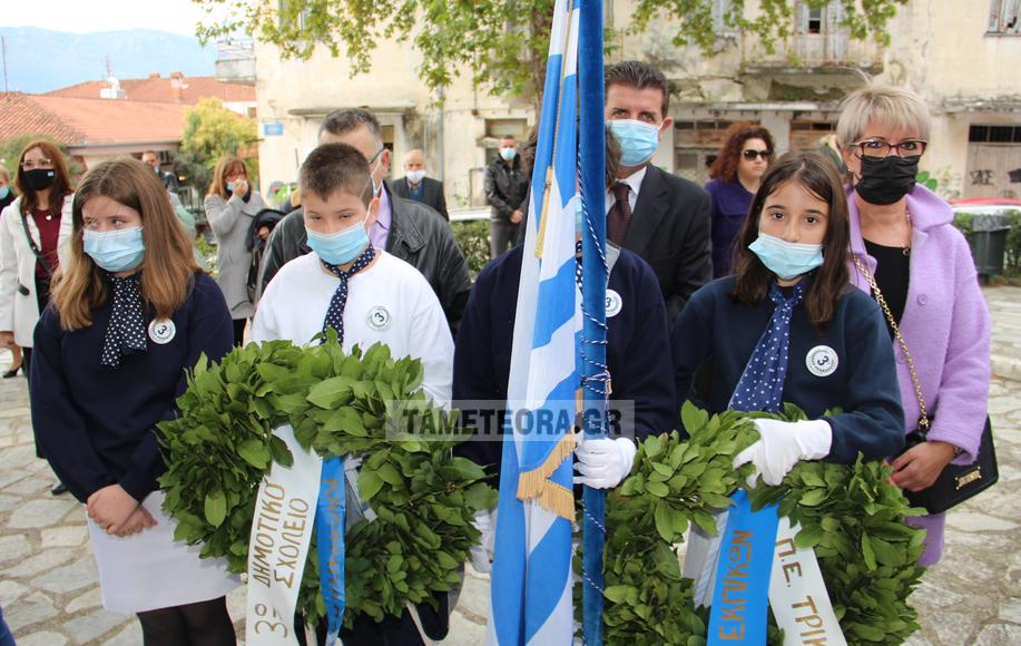 Αμέσως μετά την επίσημη Δοξολογία στον Μητροπολιτικό Ναό Αγίου Βησσαρίωνος τελέστηκε από τον Σεβασμιώτατο Μητροπολίτη Σταγών και Μετεώρων στο Ηρώο των πεσόντων στο προαύλιο του Ιερού Μητροπολιτικού Ναού Αγίου Βησσαρίωνος Καλαμπάκας επιμνημόσυνη δέηση και ακολούθησε κατάθεση στεφάνων.