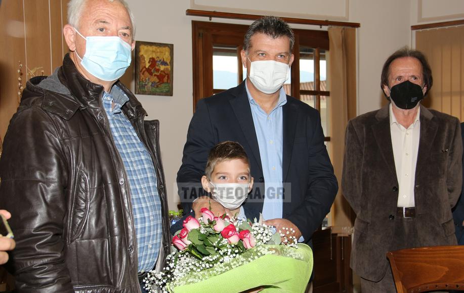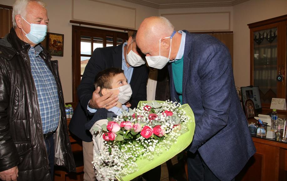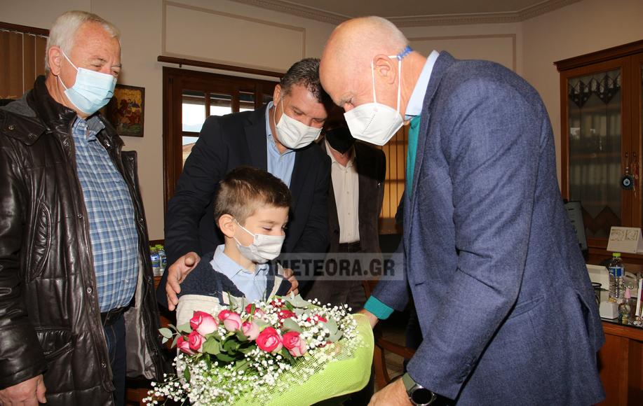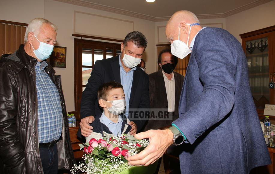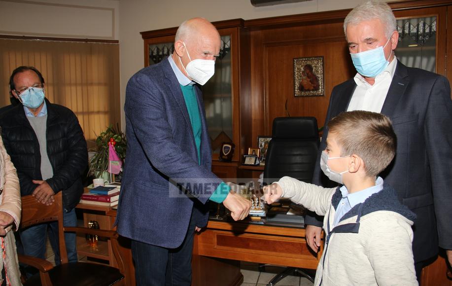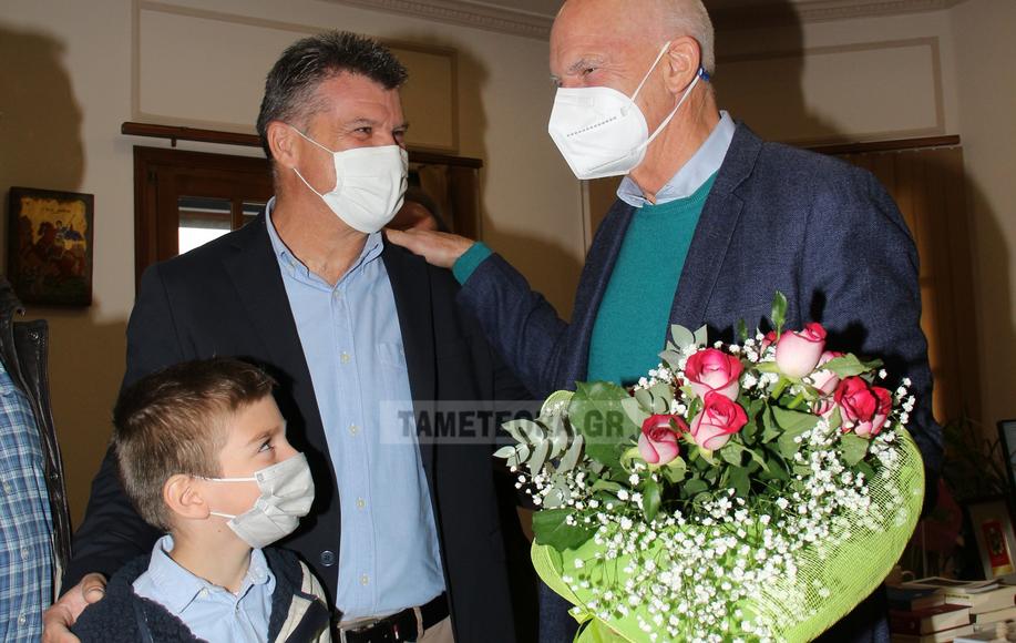 Νωρίτερα ο γιός του Αντιδημάρχου Γιώργου Παπανικολάου, Γιάννης, υποδέχθηκε τον κ. Παπανδρέου στο γραφείο του Δημάρχου με μία ανθοδέσμη.