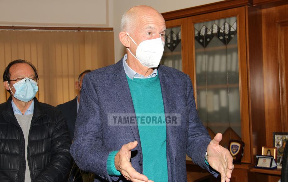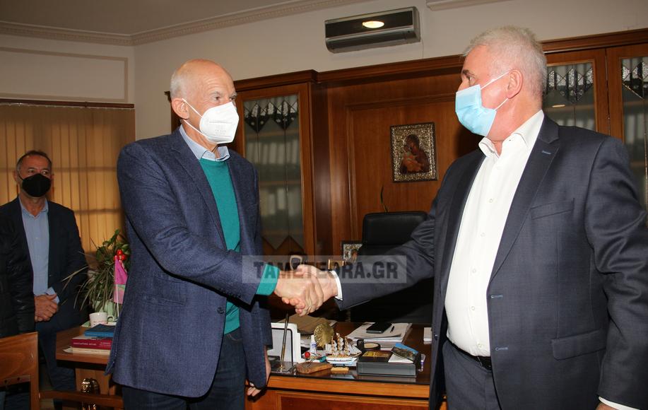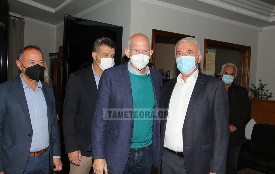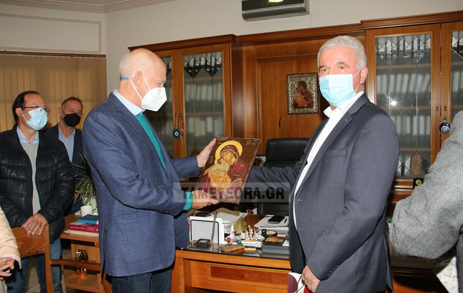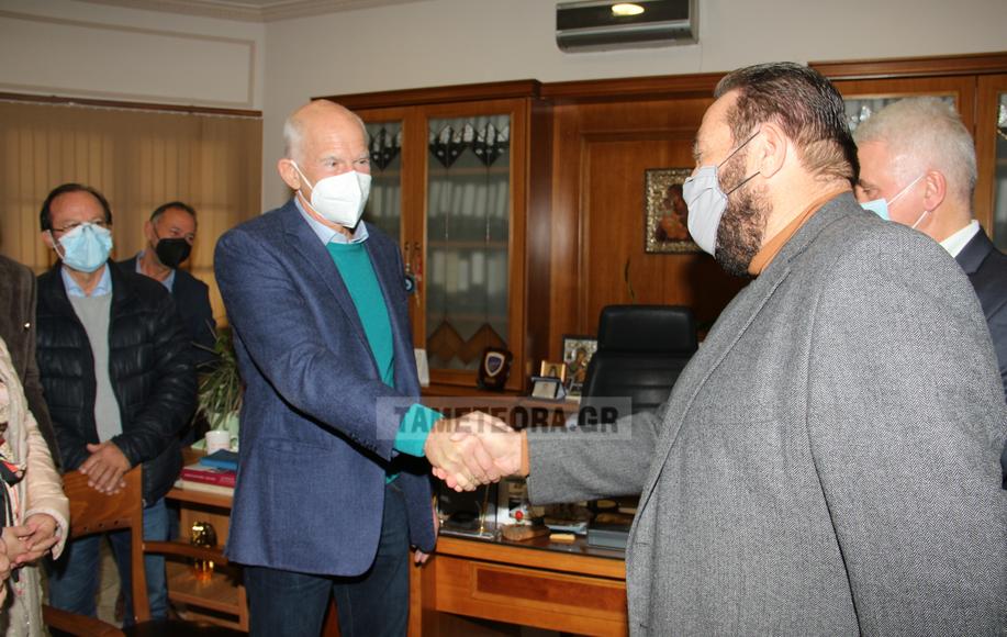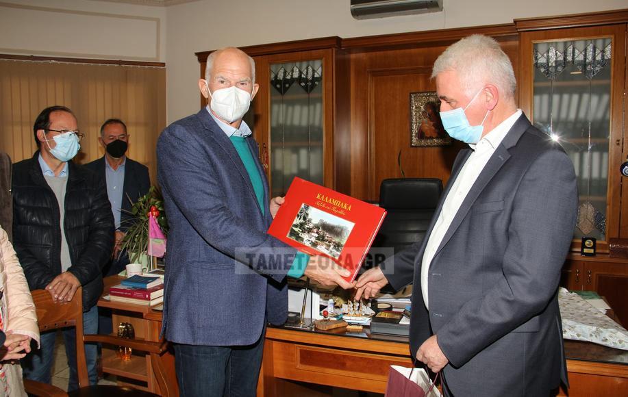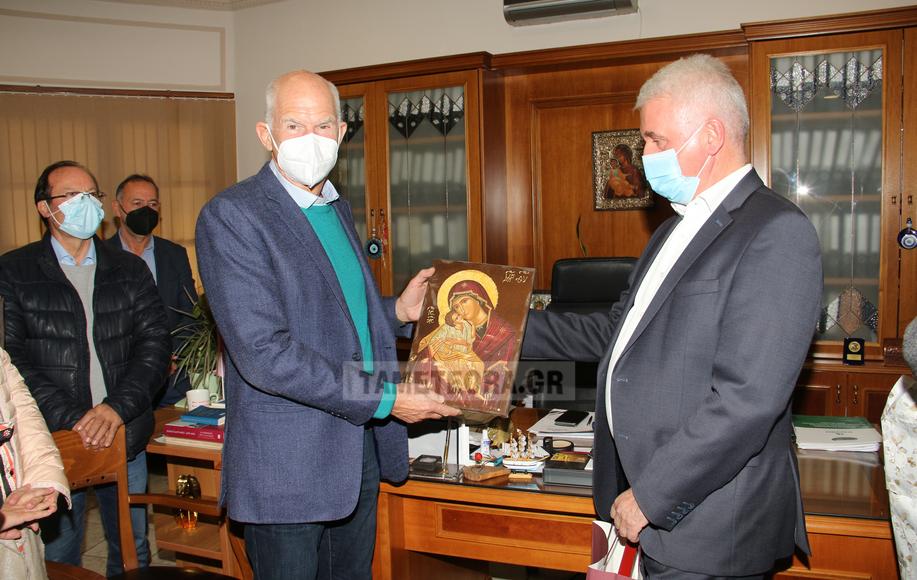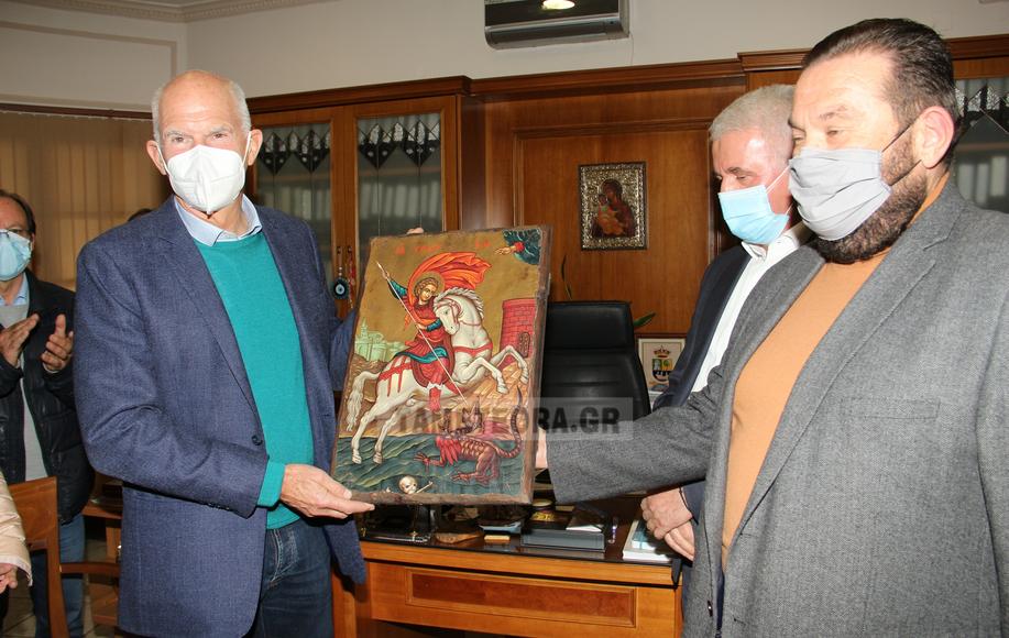 Στο κ. Παπανδρέου ο Δήμαρχος πρόσφερε μία εικόνα της Παναγίας κι ένα βιβλίο για την ιστορία της πόλης μας, ενώ ο κ. Λύπας του πρόσφερε μία εικόνα του Αγίου Γεωργίου.