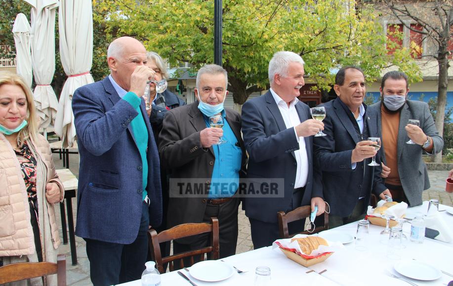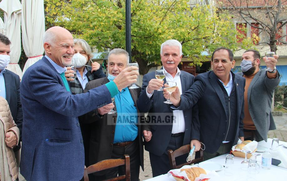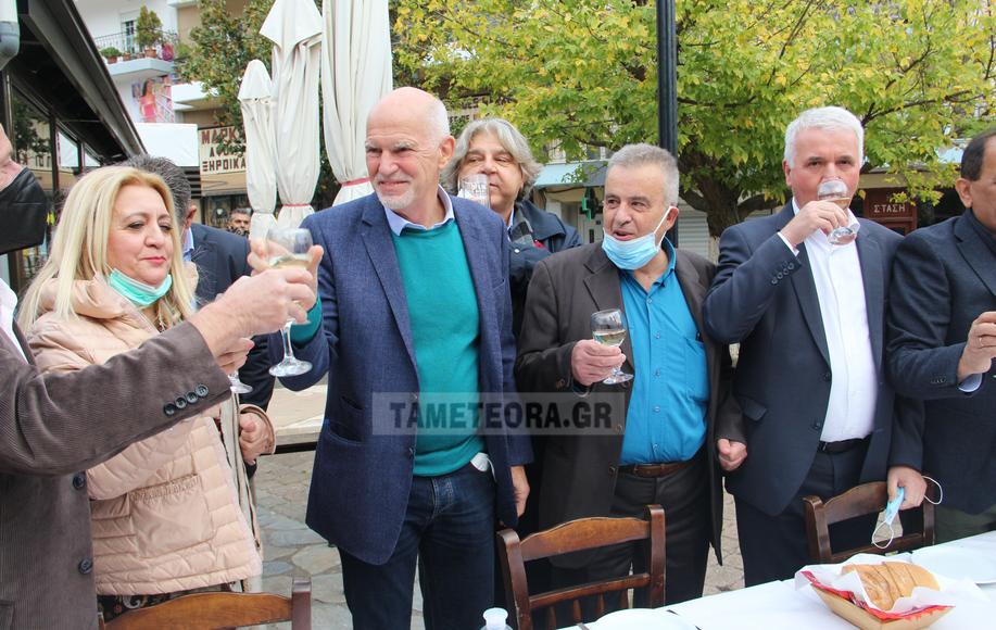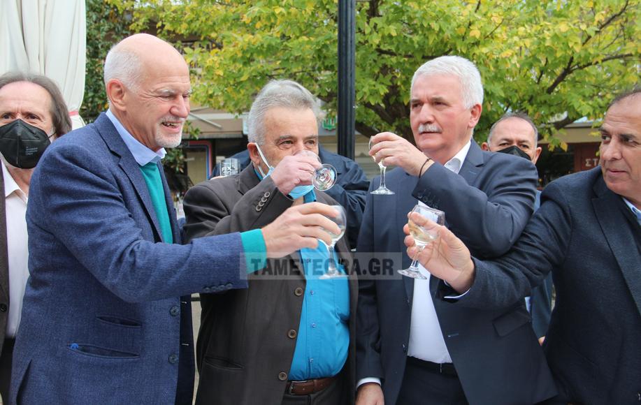 Το πρόγραμμα του κ. Παπανδρέου δεν του επέτρεψε να παρακαθίσει στο γεύμα που είχε ετοιμαστεί, αλλά λίγο πριν από την αναχώρησή του τσούγκρισε το ποτήρι του στο εστιατόριο “Πανελλήνιο” της πλατείας Δημαρχείου, αποχαιρετώντας τον Δήμαρχο και τα τοπικά στελέχη.