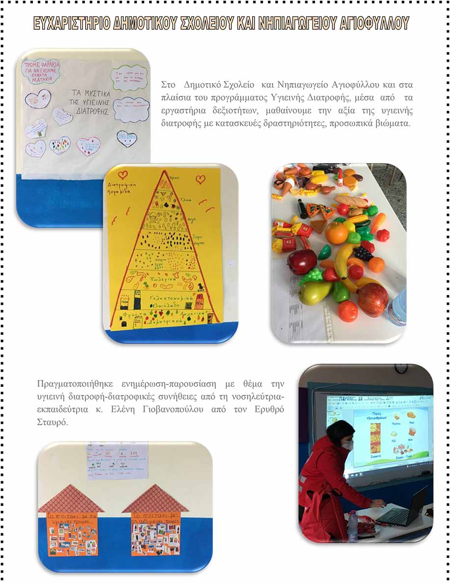 Στο Δημοτικό Σχολείο και Νηπιαγωγείο Αγιοφύλλου και στα πλαίσια του προγράμματος Υγιεινής Διατροφής, μέσα από τα εργαστήρια δεξιοτήτων, μαθαίνουμε την αξία της υγιεινής