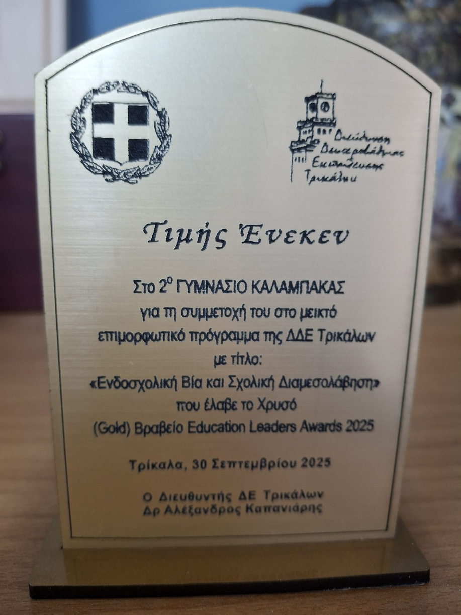 Συμμετοχή και βράβευση του σχολείου μας στην εκδήλωση διάχυσης του προγράμματος της Δ.Δ.Ε. Τρικάλων «Ενδοσχολική Βία & Σχολική Διαμεσολάβηση»