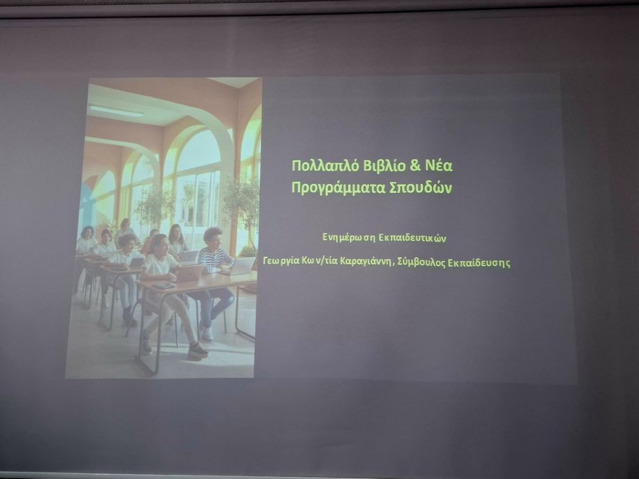 Η ενημέρωση πραγματοποιήθηκε από τη Γεωργία–Κωνσταντία Καραγιάννη, Σχολική Σύμβουλο Παιδαγωγικής Ευθύνης, η οποία παρουσίασε τις βασικές αρχές και τους στόχους των νέων Προγραμμάτων Σπουδών, καθώς και τη φιλοσοφία του «Πολλαπλού Βιβλίου» ως ενός καινοτόμου εκπαιδευτικού εργαλείου που προάγει τη διαφοροποιημένη διδασκαλία και ενισχύει την ενεργό συμμετοχή των μαθητών στη μαθησιακή διαδικασία.