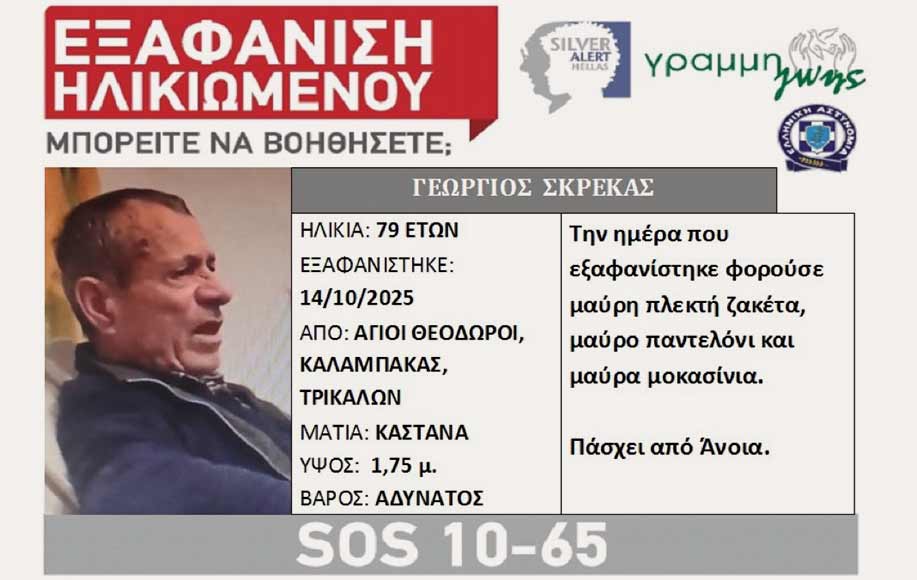 Η εξαφάνισή του έχει γίνει γνωστή πανελληνίως και όχι μόνο, αφού αναζητείται και μέσω της υπηρεσίας Silver Alert, ενώ με τον Γεώργιο Σκρέκα ασχολήθηκε και η γνωστή εκπομπή της κ. Νικολούλη την περασμένη Παρασκυή, χωρίς αποτέλεσμα.