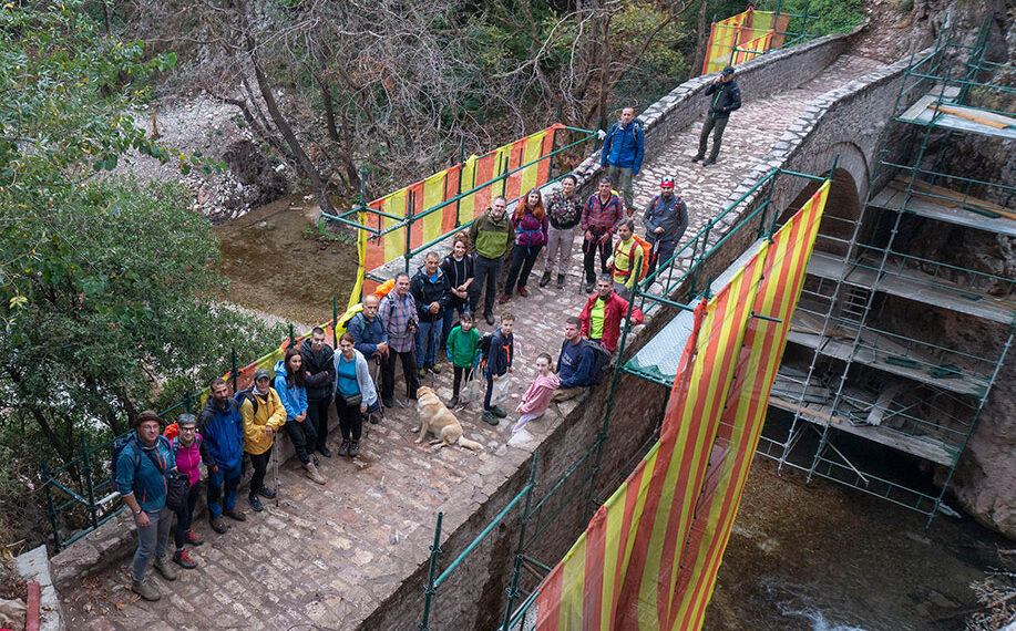 Φτάνοντας στο γεφύρι, η εικόνα είναι μάλλον αποκαρδιωτική αφού ο μεγάλος καταρράκτης δεν έχει νερό λόγω της ανομβρίας, έτσι μέρος από τη μαγεία του σημείου έχει χαθεί, ελπίζουμε προσωρινά. Σκαλωσιές περιβάλλουν το γεφύρι, στο κατάστρωμα του οποίου προεξέχουν οι σωλήνες των τσιμεντοενέσεων. Υποστηρικτικά έργα απαραίτητα για να χαιρόμαστε και στο μέλλον ένα από τα χαρακτηριστικότερα γεφύρια του ορεινού μας όγκου.