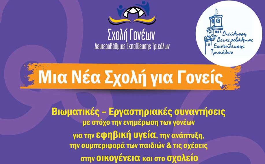 Η Διεύθυνση Δευτεροβάθμιας Εκπαίδευσης Τρικάλων, ο Δήμος Τρικκαίων, η Περιφέρεια Θεσσαλίας – Περιφερειακή Ενότητα Τρικάλων και το Πανεπιστήμιο Θεσσαλίας – Παιδαγωγικό Τμήμα Ειδικής Αγωγής Εργαστηρίου Ψυχολογίας και Εφαρμογών στην Εκπαίδευση, με την επιστημονική – παιδαγωγική εποπτεία των Συμβούλων Εκπαίδευσης της Δ.Δ.Ε. Τρικάλων, σε συνεργασία με τις σχολικές μονάδες, συνδιοργανώνουν και το σχολικό έτος 2025-26 τη Σχολή Γονέων της Διεύθυνσης Δευτεροβάθμιας Εκπαίδευσης Τρικάλων.