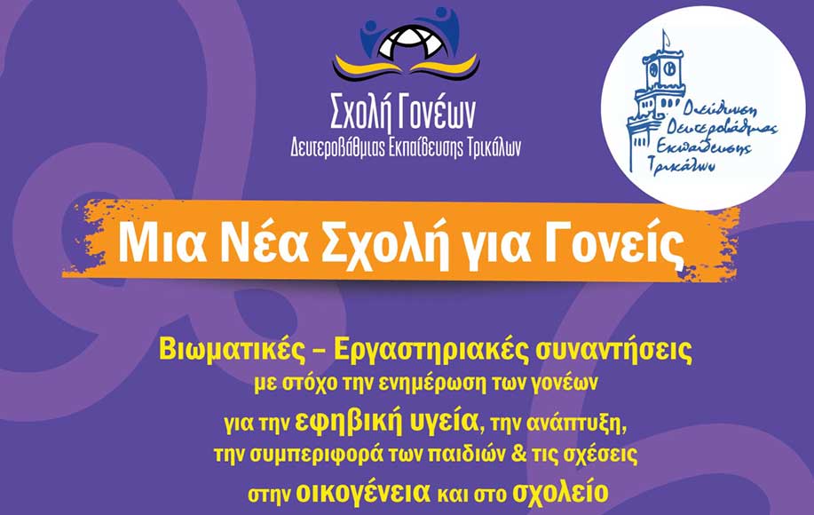 Η Διεύθυνση Δευτεροβάθμιας Εκπαίδευσης Τρικάλων, ο Δήμος Τρικκαίων, η Περιφέρεια Θεσσαλίας – Περιφερειακή Ενότητα Τρικάλων και το Πανεπιστήμιο Θεσσαλίας – Παιδαγωγικό Τμήμα Ειδικής Αγωγής Εργαστηρίου Ψυχολογίας και Εφαρμογών στην Εκπαίδευση, με την επιστημονική – παιδαγωγική εποπτεία των Συμβούλων Εκπαίδευσης της Δ.Δ.Ε. Τρικάλων, σε συνεργασία με τις σχολικές μονάδες, συνδιοργανώνουν και το σχολικό έτος 2025-26 τη Σχολή Γονέων της Διεύθυνσης Δευτεροβάθμιας Εκπαίδευσης Τρικάλων.